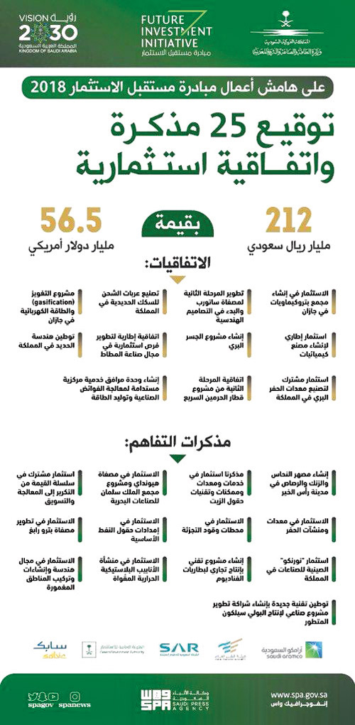وأفاد بأن المملكة برؤيتها الجديدة تهتم بالفن، وقد شاركت روسيا في فعاليات مبادرة الاستثمار برسومات للفنان (فاسيلي كاندينسكي) فهو يعد من رواد الفن الحديث، وبالإمكان بناء تعاون في مجالي الفن والثقافة، والعديد من رواد الأعمال الروس، مستعدين للدخول في شراكات مع المملكة في مجالات الاستثمار والتقنية والبنية التحتية. إلى ذلك، وقّعت أرامكو السعودية خلال مشاركتها في فعاليات ملتقى مبادرة مستقبل الاستثمار أمس، 15 مذكرة تفاهم في عدّة مجالات تعاونية وإستراتيجية بقيمة تبلغ نحو 34 مليار دولار.