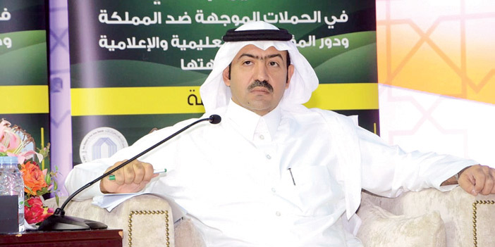 وأوضح الأستاذ الدكتور فهد العسكر عضو هيئة التدريس بكلية الإعلام والاتصال في محور (أهداف الحملات الإعلامية الموجهة ضد المملكة، ومرتكزاتها) مجموعة من الحقائق التي تؤسس لمداخلته، مستعرضاً نماذج من الحملات الإعلامية المضللة التي مرت بها المملكة العربية السعودية، مستشهداً بحادثة مقتل الصحافي جمال خاشقجي، وكيف تعاطى الإعلام مع هذه القضية، مؤكداً عدم وجود إعلام محايد حولها، كما تناول الحملات التي شهدتها السعودية قبل توحيدها وحتى حروب الجيل الرابع، لافتاً إلى أن الغرض منها التضليل الإعلامي لتحقيق مكاسب، ومصالح سياسية، واقتصادية، كما ذكر أيضاً مرتكزات التغيير، مختتماً مداخلته بعدة وسائل للخروج من هذه الحملات والتصدي لها وأهمها الثقة في الله والالتفاف حول القيادة والوعي بأهداف هذه الحملات.