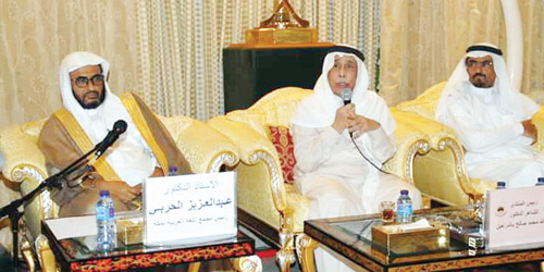 بعدها قدم أمين مجلس أمناء المجمع الأستاذ سليمان بن عواض الزايدي شرحاً تفصيلياً لمراحل وخطوات تأسيس المجمع بمكة بداية من الفكرة التي تبناها الأستاذ الدكتور عبدالعزيز الحربي وعمل عليها منفرداً حتى تم تكوين مجلس أمناء للمجمع برئاسة فضيلة الشيخ الدكتور صالح بن حميد وعضوية العديد من رجال المال والأعمال من أبناء مكة المكرمة. حتى أصبح صرحاً ومعلماً حضارياً في مكة المكرمة. بعد ذلك تحدث رئيس ومؤسس المجمع الأستاذ الدكتور عبدالعزيز الحربي الذي قدم شكره وتقديره لرئيس المنتدى على هذه الاستضافة وإتاحة الفرصة للتعريف بالمجمع أمام رواد وحضور هذا المنتدى الثقافي الذي عرف بمكيته وتبنيه المواضيع الثقافية والفكرية التي تخدم المجتمع السعودي وتبرز مظاهر الحركة الثقافية في المملكة العربية السعودية بعد ذلك عرج الأستاذ الدكتور عبدالعزيز الحربي عن دور المجمع الحضاري والفكري في المحافظة على اللغة العربية وتقديمها للانتشار بالمحيط العالمي. كما استشهد بأحاديث ومواقف من التراث العربي توضح أهمية اللغة العربية ودور العلماء في خدمتها والذود والدفاع عنها. ومن جمالها حين نهتم في قراءة القرآن مفسرين الآيات لغة وشرعاً.