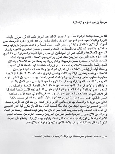 إن منطقة القصيم ومحافظاتها ومراكزها وقراها وأهاليها كافة يعيشون فرحة كبيرة وتفاؤلاً بالزيارة المباركة والكريمة من مقام خادم الحرمين الشريفين الملك سلمان بن عبدالعزيز - حفظه الله-، ولا شك أن الزيارة ستحمل في طياتها بشائر خير ونماء من المشاريع المتنوّعة وفق الحاجة القائمة تواكباً مع هذا التطور النوعيّ السريع الذي يسابق الزمن بفضل الله ثم حرص واهتمام ولاة الأمر، في ظل ما يعيشه هذا البلد الأمين وشعبه الوفي من أمن ورخاء واستقرار، والزيارات ليست مستغربة من ملك الحزم والعزم، وتأتي امتداداً لنهج مؤسس هذه البلاد، ومن منطلق أن القيادة والشعب كالجسد الواحد في توادّهم وتراحمهم والتفافهم حول قيادتهم, يتبادلون الشعور في الأفراح والأتراح, لذا فإن هذه الأسرة المالكة الكريمة من أكبر النعم التي أسداها المنعم سبحانه لهذا البلد الأمين قبلة المسلمين قاطبة». وما تشهده بلادنا من نهضة هائلة بمختلف الميادين إنما تحقّق بفضل الله تعالى ثم ما توليه الدولة - أدام الله عزّها- من اهتمامات وتوجيهات للسعي في تحقيق خدمة وراحة ورفاهية المواطن أينما كان موقعه, وأسأل رب العزة والجلال أن يديم علينا ما نحن فيه من أمن وأمان ورخاء واستقرار يحسدنا عليها الحاسدون, وأن يحفظ لنا قادتنا وولاة أمرنا ويمدّ في أعمارهم ويمنحهم موفور الصحة والعافية، وأن يجزيهم خير الجزاء بما قدّموه ويقدمونه من جهود لشعبهم ووطنهم ومقدساته إنه تعالى على كل شيء قدير.