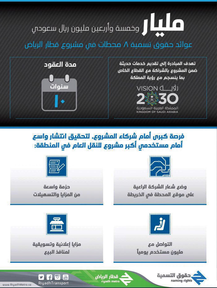 وأشار المهندس طارق الفارس أن مبادرة طرح مزايدة بيع حقوق تسمية عدد من المحطات ضمن المشروع، تتيح الفرصة أمام كبرى كيانات القطاع الخاص المحلي والدولي من شركات ومؤسسات ومصارف ومصانع وعلامات تجارية، لتحقيق انتشار واسع لمنتجاتها وخدماتها وترسيخ علامتها التجارية ونشر حملاتها التسويقية، ضمن أكبر مشروع للنقل العام في المنطقة، يستهدف استيعاب أكثر من مليون راكب يومياً في مرحلة التشغيل الأولى، ويعتزم رفع طاقته الاستيعابية القصوى إلى 3.6 مليون راكب يومياً مستقبلاً -بمشيئة الله-.