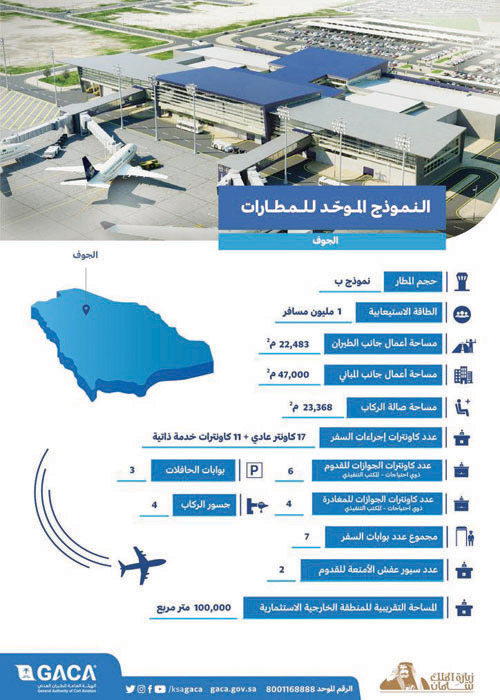 وأضاف معاليه: مطار الجوف الجديد سيتم تنفيذه وفق نموذج المطارات الموحد (ب) الذي يستوعب مليون مسافر سنويًّا، بينما سيتم إنشاء مطار القريات الجديد وفق نموذج المطارات الموحد (أ) الذي يستوعب نصف مليون مسافر سنويًّا. كما تهدف الهيئة عبر مشروع مطارَيْ الجوف والقريات الجديدَيْن إلى استيعاب النمو الكبير في الطلب على النقل الجوي من قِبل سكان المنطقة والقادمين إليها، والرفع من مستوى جودة الخدمات المقدمة للمسافرين ورواد المطارَيْن، إضافة إلى دعم البنية الاقتصادية للمنطقة.