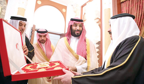 وفي بداية الجلسة رحب الملك حمد بن عيسى بزيارة سمو ولي العهد لمملكة البحرين، معرباً عن سعادته بهذه الزيارة وما تتميز به العلاقات الأخوية التاريخية الوثيقة التي تربط بين البلدين والشعبين الشقيقين. فيما عبر سمو ولي العهد عن شكره لجلالة ملك البحرين على حفاوة الاستقبال وكرم الضيافة. ومنح جلالة ملك البحرين وسام الشيخ عيسى بن سلمان آل خليفة من الدرجة الممتازة لسمو ولي العهد تقديراً لجهود سموه في دعم وتعزيز العلاقات السعودية البحرينية.