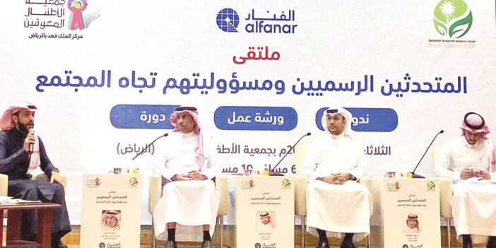 نظم المركز السعودي للمسؤولية الاجتماعية بالشراكة مع جمعية الأطفال المعوقين الثلاثاء الماضي «ملتقى المتحدثين الرسميين ومسؤوليتهم تجاه المجتمع» تحت عنوان «مع المجتمع»، بمقر جمعية الأطفال المعوقين.