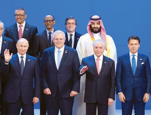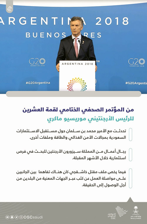 وتحتل المملكة المرتبة الثالثة بين دول مجموعة العشرين من حيث الاحتياطيات الأجنبية بـ507.2 مليار دولار، بعد كل من الصين واليابان. ويبلغ إجمالي الاحتياطيات الأجنبية لدول مجموعة العشرين - باستثناء تكتل الاتحاد الأوروبي - نحو 7.9 تريليون دولار بنهاية شهر أكتوبر الماضي، وتُشكل الاحتياطيات الأجنبية للسعودية 6.4%، من الاحتياطات الإجمالية لدول المجموعة. وأعلن رئيس الأرجنتين ماوريسيو ماكري أنه سيبحث بعض الأفكار الاستثمارية مع السعودية. وكانت اجتماعات قمة مجموعة العشرين قد اختتمت أعمالها مساء أمس، بعد اتفاق القادة على إصلاح منظمة التجارة العالمية، وركز القادة على مستقبل العمل والبنية التحتية والتنمية المستدامة والأمن الغذائي.
