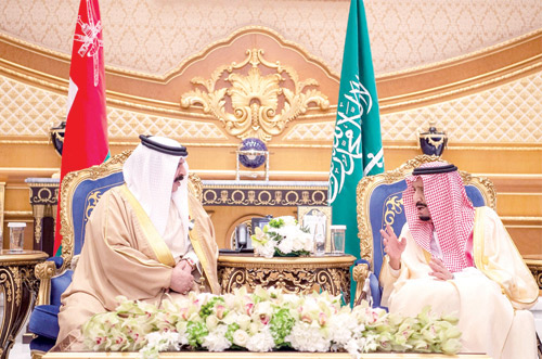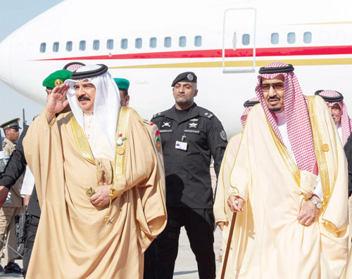 ووصل جلالة الملك حمد بن عيسى آل خليفة ملك مملكة البحرين. وكان في استقبال جلالته بمطار قاعدة الملك سلمان الجوية أخوه خادم الحرمين الشريفين الملك سلمان بن عبدالعزيز آل سعود الذي رحب به وبمرافقيه في المملكة العربية السعودية. كما كان في استقباله صاحب السمو الملكي الأمير فيصل بن بندر بن عبدالعزيز أمير منطقة الرياض، ومعالي وزير التجارة والاستثمار الدكتور ماجد بن عبدالله القصبي الوزير المرافق، ومعالي الأمين العام لمجلس التعاون لدول الخليج العربية الدكتور عبداللطيف بن راشد الزياني، ومعالي رئيس المراسم الملكية الأستاذ خالد بن صالح العباد، والشيخ حمود بن عبدالله آل خليفة سفير مملكة البحرين لدى المملكة، وسفير خادم الحرمين الشريفين لدى مملكة البحرين الدكتور عبدالله بن عبدالملك آل الشيخ. بعد ذلك صافح جلالة الملك حمد بن عيسى آل خليفة مستقبليه، صاحب السمو الملكي الأمير سعود بن عبدالمحسن بن عبدالعزيز المستشار الخاص لخادم الحرمين الشريفين، وصاحب السمو الملكي الأمير خالد بن بندر بن عبدالعزيز مستشار خادم الحرمين الشريفين، وصاحب السمو الملكي الأمير تركي بن محمد بن فهد بن عبدالعزيز المستشار في الديوان الملكي، وصاحب السمو الملكي الأمير عبدالعزيز بن سعود بن نايف بن عبدالعزيز وزير الداخلية، وصاحب السمو الأمير خالد بن عبدالعزيز بن عياف وزير الحرس الوطني، وأصحاب المعالي الوزراء وقادة القطاعات العسكرية. كما صافح خادم الحرمين الشريفين الوفد الرسمي المرافق لجلالة ملك مملكة البحرين. وبعد استراحة قصيرة في صالة التشريفات غادر جلالة الملك حمد بن عيسى آل خليفة ملك مملكة البحرين في موكب رسمي إلى قصر الدرعية. ويضم الوفد الرسمي المرافق لجلالة ملك البحرين، سمو الشيخ ناصر بن حمد آل خليفة الممثل الشخصي لجلالة الملك للأعمال الخيرية وشؤون الشباب، وسمو الشيخ محمد بن مبارك آل خليفة نائب رئيس مجلس الوزراء، ومعالي الشيخ خالد بن أحمد آل خليفة وزير الديوان الملكي، ومعالي الشيخ خالد بن أحمد بن محمد آل خليفة وزير الخارجية، ومعالي وزير شؤون الإعلام علي بن محمد الرميحي.