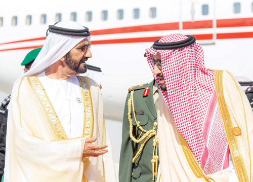 كما وصل صاحب السمو الشيخ محمد بن راشد آل مكتوم نائب رئيس دولة الإمارات العربية المتحدة رئيس مجلس الوزراء حاكم دبي. وكان في استقباله بمطار قاعدة الملك سلمان الجوية أخوه خادم الحرمين الشريفين الملك سلمان بن عبدالعزيز آل سعود الذي رحب به وبمرافقيه في المملكة العربية السعودية. كما كان في استقباله صاحب السمو الملكي الأمير فيصل بن بندر بن عبدالعزيز أمير منطقة الرياض، ومعالي وزير الاقتصاد والتخطيط الأستاذ محمد بن مزيد التويجري الوزير المرافق، ومعالي الأمين العام لمجلس التعاون لدول الخليج العربية الدكتور عبداللطيف بن راشد الزياني، ومعالي رئيس المراسم الملكية الأستاذ خالد بن صالح العباد، والشيخ شخبوط بن نهيان آل نهيان سفير دولة الإمارات العربية المتحدة لدى المملكة، والقائم بأعمال سفارة خادم الحرمين الشريفين لدى الإمارات سعود بن فهد السويلم. بعد ذلك صافح صاحب السمو الشيخ محمد بن راشد آل مكتوم مستقبليه، صاحب السمو الملكي الأمير سعود بن عبدالمحسن بن عبدالعزيز المستشار الخاص لخادم الحرمين الشريفين، وصاحب السمو الملكي الأمير خالد بن بندر بن عبدالعزيز مستشار خادم الحرمين الشريفين، وصاحب السمو الملكي الأمير تركي بن محمد بن فهد بن عبدالعزيز المستشار في الديوان الملكي، وصاحب السمو الملكي الأمير عبدالعزيز بن سعود بن نايف بن عبدالعزيز وزير الداخلية، وصاحب السمو الأمير خالد بن عبدالعزيز بن عياف وزير الحرس الوطني، وأصحاب المعالي الوزراء، وقادة القطاعات العسكرية. كما صافح خادم الحرمين الشريفين الوفد الرسمي المرافق لنائب رئيس دولة الإمارات العربية المتحدة رئيس مجلس الوزراء حاكم دبي. وبعد استراحة قصيرة في صالة التشريفات غادر صاحب السمو الشيخ محمد بن راشد آل مكتوم في موكب رسمي إلى قصر الدرعية. ويضم الوفد الرسمي المرافق لسمو نائب رئيس دولة الإمارات، سمو الشيخ منصور بن زايد آل نهيان نائب رئيس مجلس الوزراء وزير شؤون الرئاسة، وسمو الشيخ عبدالله بن زايد آل نهيان وزير الخارجية والتعاون الدولي، ومعالي وزير شؤون مجلس الوزراء والمستقبل محمد بن عبدالله القرقاوي، ومعالي وزير الدولة للشؤون الخارجية الدكتور أنور بن محمد قرقاش، والشيخ شخبوط بن نهيان آل نهيان سفير دولة الإمارات العربية المتحدة لدى المملكة.