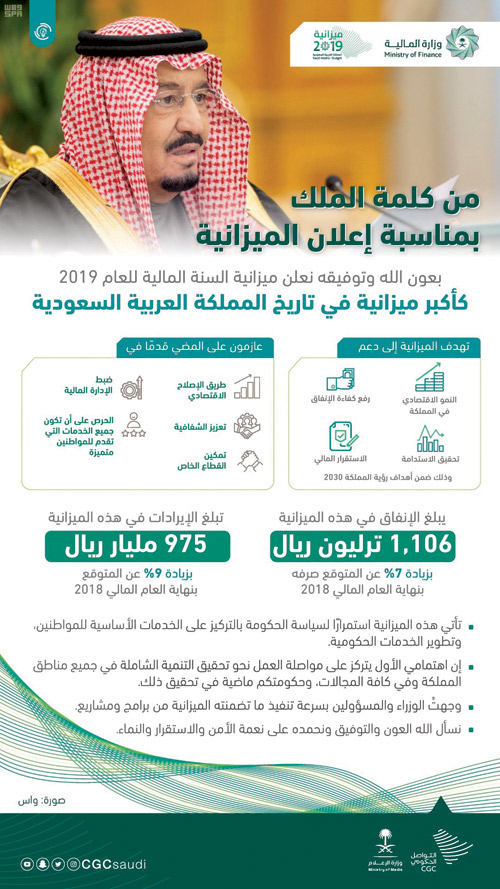 أعلنت حكومة خادم الحرمين الشريفين الملك سلمان بن عبدالعزيز -حفظه الله- أمس، الميزانية العامة للدولة للعام المالي 1440 / 1441هـ (2019م) بحجم إنفاق قدره (1.106) ترليون ريال. بمعدل نمو 7.3% عن المتوقع لعام 2018م.