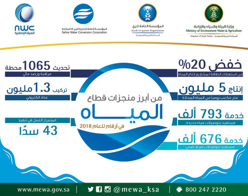 وفي قطاع المياه أكملت الوزارة مشاريع بقيمة 12 مليار ريال في إنتاج ونقل وتوزيع ومعالجة المياه خلال العام 2018، إضافة إلى مشاريع مخطط لها تصل قيمتها إلى 75 مليار ريال، وتستهدف طرح مشاريع جديدة بقيمة 36 مليار ريال خلال الربع الأول من العام المقبل 2019، ليصل الإجمالي إلى نحو 123 مليار ريال يتم منها تنفيذ مشاريع بقيمة 17 مليار ريال مع القطاع الخاص، حيث تستهدف الوزارة تطوير قطاع المياه في جميع مناطق المملكة لأهميته الحيوية بتكلفة إجمالية تصل إلى 300 مليار ريال حتى 2030.