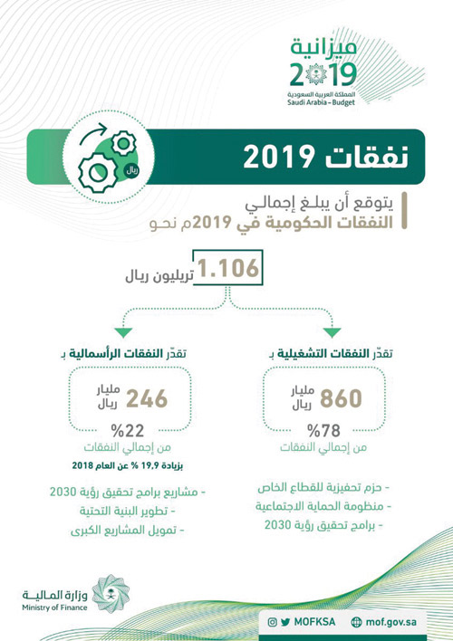 بدوره، أكد معالي وزير المالية الأستاذ محمد بن عبدالله الجدعان، أن المرتكزات الأساسية لتوجهات الدولة بميزانية 2019 اهتمت بتوفير الخدمات للمواطن بشكل متميز، والاستثمار في البنية التحتية التي تمس المواطن، والاستمرار في تنميتها خلال هذا العام والأعوام القادمة، كما حرصت الدولة على دعم النمو الاقتصادي وتعزيزه بشكل كبير من خلال الشراكة مع قطاع الخاص، ودعم المنشآت الصغيرة والمتوسطة، وقد تم إطلاق عدد من البرامج والاستثمارات طويلة الأجل.