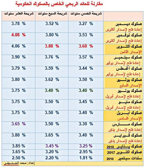 ولفت المصرفي مُتخصص بأسواق الدين والائتمان محمد خالد الخنيفر إلى أنه المرجح أن أحداث عالمية ومحلية قد لعبت دوراً مؤثراً في انخفاض العوائد. مبينًا أنه على الصعيد العالمي أسهم تدني عوائد سندات الخزانة الأمريكية في تشجيع المصدرين نحو التوجه لأسواق الدين. أما على الصعيد المحلي فيدور حديث بأن هناك توجهًا حكوميًا نحو إعفاء عوائد الصكوك الحكومية من الزكاة مع الحسبة الجديدة، الأمر الذي يحفز المستثمرين على اقتناء تلك الأوراق المالية، وعلى الجانب الآخر هناك حديث بأن جهود توسيع قاعدة المستثمرين قد بدأت في الظهور، وهذا ما تجلى مع شريحة العشر السنوات التي لا تحبذها البنوك ولكن تجد إقبالاً من شركات التأمين.
