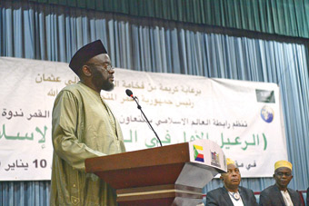 وفي الختام ألقى فضيلة الدكتور محمد أحمد لوح رئيس مجلس أمناء اتحاد علماء إفريقيا كلمة المشاركين قال فيها: «إن جهود رابطة العالم الإسلامي وعملها في القارة الإفريقية لم يعد خافياً على ذي عينين.. فقد عملت الرابطة في إفريقيا - كما عملت في غيرها - لترسيخ عدد من المبادئ والقيم، يلاحظها كل من تتبع عملها في العالم.. ومنها: السعي إلى نشر الإسلام في صورته الحقيقية الناصعة النقية الصافية من الشوائب والإضافات، الإسلام البعيد عن العنف والغلو والأفكار الهدامة والمتطرفة، الإسلام الذي يقدم للبشرية بشائر الخير والرحمة والسلام والنماء والوئام، والسعي إلى توحيد الصفوف ونبذ الفرقة والتشتت بين أبناء الأمة الإسلامية، ومنابذة الطائفية البغيضة التي مزقت الأمة وأضعفتها، تلك الطائفية التي تستنكر أمجاد الرعيل الأول، وتبني خطتها على نبش مساوئ التاريخ إن وجدت، وإلا عمدت إلى اختلاقها ونشرها في أوساط العامة وأهل الغفلة والثقافة المتدنية. وأشار إلى أن الرابطة وقفت سداً منيعاً لكل فكر يدعو إلى هدم الأخلاق، وتدمير المكتسبات، وعامل تنوير وتبصرة لأولئك الذين ظُلموا بتقديم الإسلام لهم في صورة قائمة مرادفة للقتل والتدمير والفتك والتفجير، وتكثيف الجهود الرامية إلى التنمية البشرية، وتنمية ثروات البلاد الفطرية التي وهبها الله إياها، وضبط فتاوى الشأن العام وتوحيدها لاسيما في القضايا الحساسة التي تعم بها البلوى، من خلال المجمع الفقهي الذي وصلت ثماره إلى القاصي والداني».