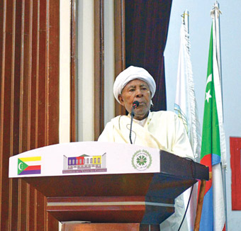 وبيّن أن جمهورية القمر المتحدة، تفتخر بدينها الإسلامي، وتسهم الجامعة في إنشاء دولة واعدة، كما يخطط ويسهر على ذلك فخامة الرئيس غزالي عثمان -حفظه الله، مشيراً إلى أن الدولة الواعدة، تنطلق من الجامعة التي تؤهل الكوادر الوطنية العلمية، وأن هذه المناسبة سوف تدشن مرحلة جديدة، في علاقاتها مع رابطة العالم الإسلامي وتسهم في توطيد العلاقات بين الجانبين، لما فيه مصلحة الجميع. بعد ذلك ألقى سماحة الشيخ طاهر أحمد مولانا جمال الليل مفتي جمهورية القمر المتحدة، كلمة أوضح فيها أن الله عز وجل اختار لنبيه صفوة الأمة ليكونوا من أصحاب رسول الله صلى الله عليه وسلم، فكانوا حقاً خير أصحاب لرسول الرحمة، وبهم انتشر الإسلام في جميع أنحاء المعمورة، وقد وصفهم الله عز وجل بالأسبقية في الفضل فقال: {وَالسَّابِقُونَ الأَوَّلُونَ مِنَ الْمُهَاجِرِينَ وَالأَنصَارِ وَالَّذِينَ اتَّبَعُوهُم بِإِحْسَانٍ رَّضِيَ اللّهُ عَنْهُمْ وَرَضُواْ عَنْهُ} (100) سورة التوبة.