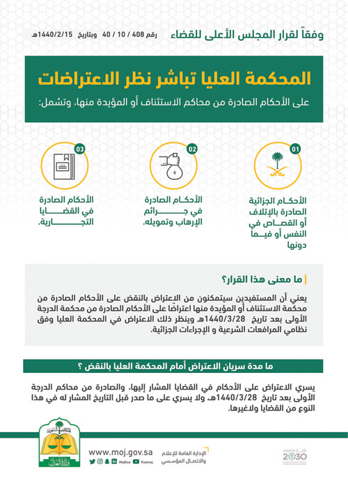وأكدت وزارة العدل، أنه بموجب هذا القرار سيتمكّن المستفيدون من الاعتراض بالنقض على الأحكام الصادرة من محاكم الاستئناف، أو المؤيّدة منها للأحكام الصادرة عن محاكم الدرجة الأولى بعد تاريخ 28 ربيع الأول 1440 هـ وينظر ذلك الاعتراض في المحكمة العليا وفقًا لما هو مقرر في نظامي المرافعات الشرعية والإجراءات الجزائية.