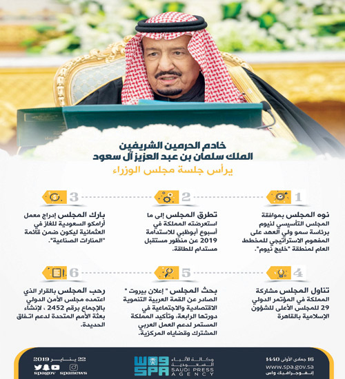 وبين معاليه أن مجلس الوزراء استعرض عقب ذلك حزمة من الملفات إزاء مستجدات الأحداث وتطوراتها على الساحتين الإقليمية والدولية، حيث تناول «إعلان بيروت» الصادر عن القمة العربية التنموية الاقتصادية والاجتماعية في دورتها الرابعة وشاركت به المملكة العربية السعودية، وما تضمنه من قرارات صادرة للإسهام في تعزيز العمل العربي المشترك، وتأمين اقتصاد عربي متكامل، وانعكاسات أزمة النازحين واللاجئين على الدول العربية المضيفة، وتأكيد المملكة المستمر لدعم العمل العربي المشترك وقضاياه المركزية.