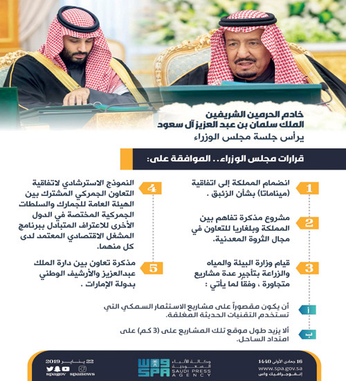 أولاً: بعد الاطلاع على ما رفعه معالي وزير البيئة والمياه والزراعة رئيس مجلس إدارة الهيئة العامة للأرصاد وحماية البيئة، وبعد النظر في قرار مجلس الشورى رقم (8 / 2) وتاريخ 13 / 3 / 1440هـ، قرر مجلس الوزراء الموافقة على انضمام المملكة العربية السعودية إلى اتفاقية (ميناماتا) بشأن الزئبق.