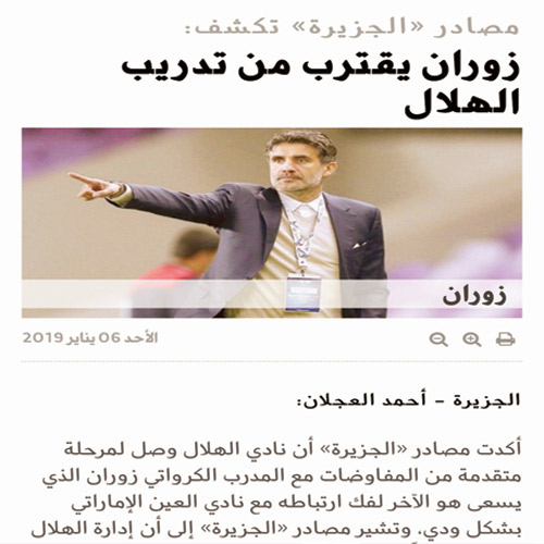 تجدر الإشارة إلى أن «الجزيرة» وعبر حسابها في «تويتر» ونسختها الورقية قد تميزت غير مرة بخبر اقتراب الاتفاق بين الهلال وزوران، كان آخرها قبل نحو 3 أسابيع تحت عنوان «زوران يقترب من تدريب الهلال».