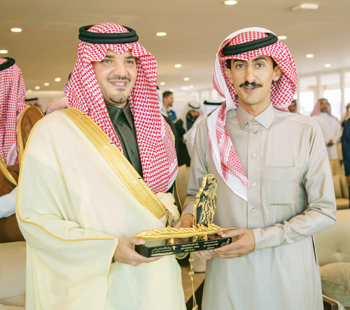 إثر ذلك سلم صاحب السمو الملكي الأمير عبدالعزيز بن سعود بن نايف بن عبدالعزيز الفائزين بالأشواط الختامية بالمسابقة كؤوس الملك عبدالعزيز لفئات الصقور المشاركة في المهرجان.