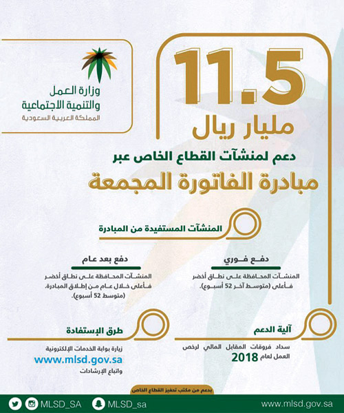 صدرت موافقة المقام السامي الكريم، على إطلاق وزارة العمل والتنمية الاجتماعية، مبادرة الفاتورة المجمعة، بالتعاون مع مكتب تحفيز القطاع الخاص، التي تهدف إلى تقديم الدعم للمنشآت الملتزمة بالتوطين.
