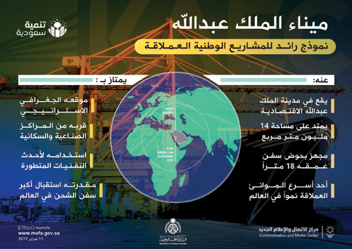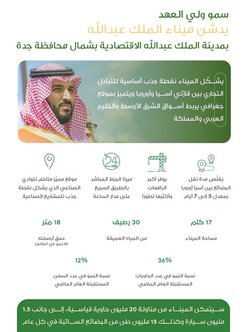 دشن صاحب السمو الملكي الأمير محمد بن سلمان بن عبدالعزيز، ولي العهد نائب رئيس مجلس الوزراء وزير الدفاع -حفظه الله- مساء أمس، ميناء الملك عبدالله، وذلك خلال زيارته لمدينة الملك عبدالله الاقتصادية.