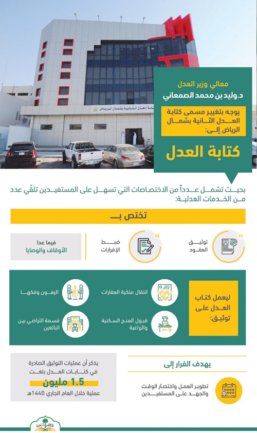 وجه معالي وزير العدل رئيس المجلس الأعلى للقضاء الشيخ الدكتور وليد بن محمد الصمعاني بالتوسع في الخدمات التي تقدمها كتابة العدل الثانية بشمال الرياض لتصبح شاملة لأعمال كتابات العدل. ونص التوجيه على أن يكون مسماها كتابة العدل بشمال الرياض واختصاصها توثيق العقود وضبط الإقرارات، بالإضافة إلى منح صلاحية تقديم خدمات التوثيق العقارية كالإفراغات. وجاء توجيه معاليه بناء على ما تقتضيه الأنظمة والتشريعات، وبناء على ما يتطلبه تطوير العمل في كتابة العدل الثانية بشمال الرياض بتعديل اختصاصاتها، بإضافة أعمال توثيق الأولى لها. كما وجه معالي وزير العدل بإضافة أعمال توثيق انتقال ملكية العقارات، والرهون وفكها، وقبول المنح السكنية والزراعية، وقسمة التراضي بين البالغين، بما يختصر الوقت والجهد على المستفيدين.