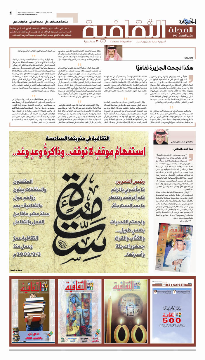 ما أن نُشر العدد الخاص (600)، الذي صدر عن «الجزيرة» واحتفى فيه المثقفون بمناسبة بلوغ «المجلة الثقافية» عددها المئوي السادس وعامها السادس عشر بمشاركة أكثر من مئة وخمسة عشر كاتبًا وكاتبة وكتبوا فيه تقديرًا وتعبيرًا عما تم من إنجاز متطلعين للمرحلة القادمة التي وصفوها بالملأى بالسعي والوعي والتحديات.. حتى انهالت رسائل وصل وعتاب من هامات وقامات من الأدباء والأديبات والكتاب.