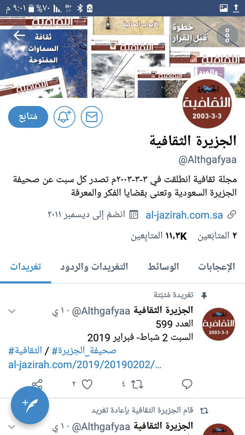 في ظل ما تشهده وسائل الإعلام (المؤسسية) من تحولات، وفي مقدمتها المؤسسات الصحفية، ما جعلها تتخفف مما تتطلبه الوظيفة الثقافية، من تنوع، وعمق، وشمولية، وتحرير، ونشر، فما تزال «المجلة الثقافية»، التي تصدرها (صحيفة الجزيرة)، على المضي في أداء رسالتها الصحفية، ووظائفها الإعلامية، وفي مقدمتها الوظيفة الثقافية، ما جعل من المجلة الثقافية (يانعة الصدور)، أسبوعيًا ما بين (10- 12- 14) صفحة، وذلك امتدادًا لرؤية، ورسالة، ولقيم، وأهداف اختطتها صحيفة الجزيرة، لمواصلة مسيرة الريادة الثقافية، رغم ما تشهده صحافة المؤسسات من تحولات، وما يشهده الإعلام الثقافي من متغيرات متتالية، ومتنامية، لتظل الوظيفة الثقافية رغم ذلك كله، إحدى الوظائف التي راهنت «الجزيرة»، وما تزال على تقديمها والأداء في مضمارها بكل ريادة واقتدار، إلى جانب الصفحات الثقافية (اليومية)، التي تواكب في متابعتها المشهد الثقافي، عبر الفنون الصحفية المختلفة.