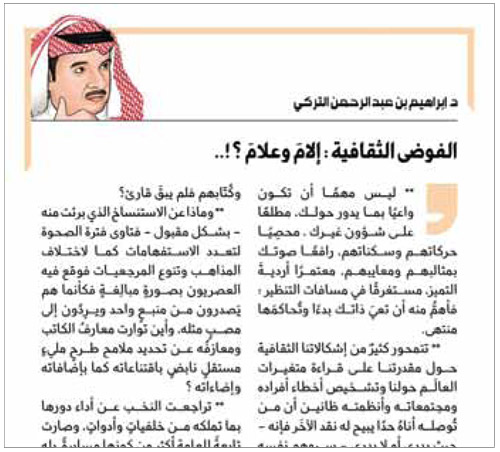 في المقالة التي كتبها الدكتور إبراهيم التركي «الفوضى الثقافية» سلطت الضوء على جزء مهم من الواقعية الثقافية عندنا وهي مسألة «اضطراب الهوية الثقافية» للمثقف السعودي وهذا الأمر هو الذي سأتحدث عنه في هذا الموضوع.