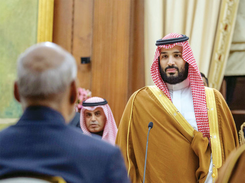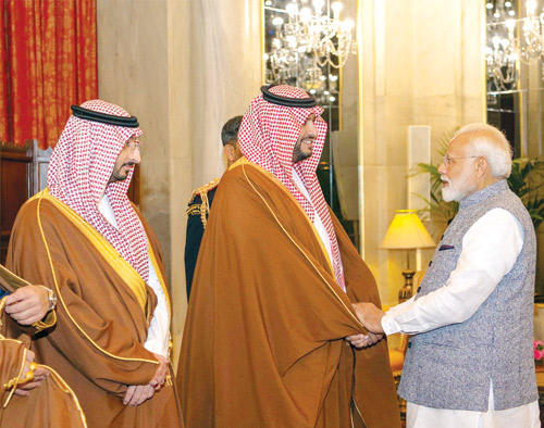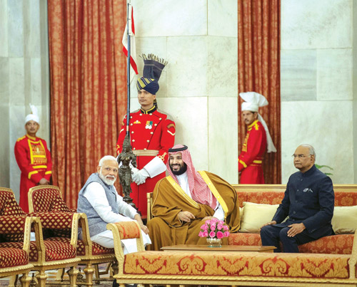 وقد ألقى صاحب السمو الملكي الأمير محمد بن سلمان بن عبد العزيز ولي العهد نائب رئيس مجلس الوزراء وزير الدفاع الكلمة التالية : شكراً فخامة الرئيس على الترحيب الحار والحفاوة التي نلقاها اليوم، أشكر أيضاً دولة رئيس الوزراء وجميع أصدقائنا في الهند العزيزة. العلاقة القديمة والتاريخية بالنسبة لنا مهمة جداً لكن اليوم نشهد حاضر مميز للغاية وفيه فرص كثيرة جداً لدولتينا، واليوم أيضاً نحتفل ونحضر إنجاز حقق في عامين وهو إنجاز كبير جداً في عدة مجالات من الاقتصاد إلى الأمن إلى السياسة وغيرها من المجالات. في هذه الزيارة بتأسيس المجلس التنسيقي الرفيع المستوى الاستراتيجي بين السعودية والهند سوف تشهد الاستراتيجية القادمة تسارعا أكبر بكثير مما حدث في السنتين الماضية، نحن تتقاطع المصالح بين السعودية والهند في مصالح كثيرة جداً وأيضاً المخاطر التي تجابهنا متشابهة وكثيرة سواء في الإرهاب أو غيرها من المخاطر، وهذا يؤكد أن علينا أن نعمل جميعاً لتحقيق جميع المصالح المجابهة لجميع التحديات.