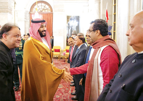 وقد أقام فخامة رئيس جمهورية الهند حفل عشاء احتفاءً بزيارة سمو ولي العهد، حيث عزف السلامان الوطنيان السعودي والهندي في بداية الحفل. كما صافح سمو ولي العهد الوفد الهندي في حفل العشاء، فيما صافح الرئيس الهندي الوفد السعودي.