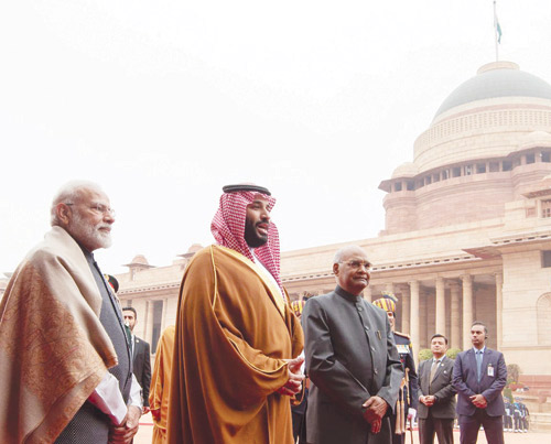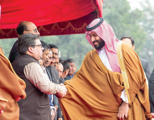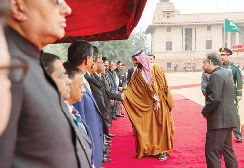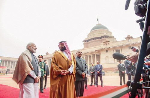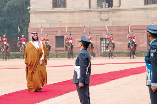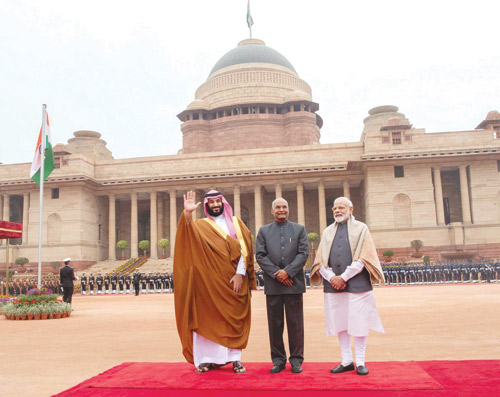 استقبل فخامة الرئيس السيد رام نات كوفيند رئيس جمهورية الهند في القصر الرئاسي في نيو دلهي أمس، صاحب السمو الملكي الأمير محمد بن سلمان بن عبدالعزيز ولي العهد نائب رئيس مجلس الوزراء وزير الدفاع، بحضور دولة رئيس الوزراء الهندي السيد ناريندرا مودي. وقد رافق موكب سمو ولي العهد للقصر الرئاسي كوكبة من الخيالة، فيما كانت المدفعية الهندية تطلق 21 طلقة ترحيبًا بمقدم سموه. وقد أجريت لسموه مراسم استقبال رسمية، حيث عزف السلامان الوطنيان للمملكة والهند، كما تفقد سموه حرس الشرف. بعد ذلك صافح سمو ولي العهد كبار مستقبليه من أصحاب المعالي الوزراء وكبار المسؤولين في الحكومة الهندية، فيما صافح فخامة الرئيس الهندي ورئيس الوزراء الهندي كلا من صاحب السمو الملكي الأمير تركي بن محمد بن فهد بن عبدالعزيز وزير الدولة عضو مجلس الوزراء وصاحب السمو الملكي الأمير عبدالله بن بندر بن عبدالعزيز وزير الحرس الوطني ومعالي وزير التجارة والاستثمار الدكتور ماجد القصبي ومعالي وزير الدولة للشؤون الخارجية الأستاذ عادل الجبير ومعالي وزير الطاقة والصناعة والثروة المعدنية المهندس خالد الفالح، ومعالي وزير الاقتصاد والتخطيط الأستاذ محمد التويجري ومعالي وزير الإعلام الأستاذ تركي الشبانة ومعالي رئيس الاستخبارات العامة الأستاذ خالد الحميدان ومعالي المستشار في الديوان الملكي المشرف العام على مكتب وزير الدفاع الأستاذ فهد العيسى ومعالي المستشار بالأمانة العامة لمجلس الوزراء الأستاذ ياسر الرميان، ومعالي سكرتير سمو ولي العهد الدكتور بندر الرشيد وسفير خادم الحرمين الشريفين لدى الهند سعود الساطي. بعد ذلك أدلى صاحب السمو الملكي الأمير محمد بن سلمان بن عبد العزيز ولي العهد نائب رئيس مجلس الوزراء وزير الدفاع بتصريح صحفي بحضور رئيس جمهورية الهند ورئيس الوزراء الهندي، أكد فيه أن العلاقات بين شبه الجزيرة العربية التي تمثل المملكة العربية السعودية 80 % من مساحتها، تعود إلى أكثر من 2000 سنة، منوهاً بمشاركة الشعبين في نهضة البلدين. وأوضح سمو ولي العهد أن زيارته للهند تأتي لبحث تطوير التعاون بين البلدين وإدخالها إلى مرحلة جديدة، مؤكداً عمق العلاقات الثنائية التي تربط بين البلدين.