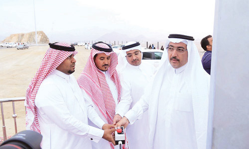 ودشن الحميدي خلال الجولة سارية العلم السعودي بمشروع مطل جبال، التي نفذت بطول 40 مترًا، في حين استمع لشرح من رئيس البلدية عن المشاريع الاستثمارية المقترحة في الموقع.