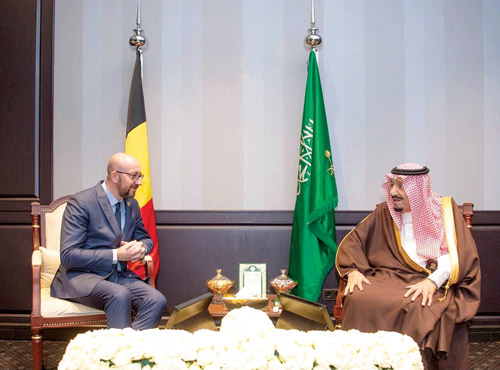 كما التقى خادم الحرمين الشريفين الملك سلمان بن عبدالعزيز آل سعود -حفظه الله- في مقر انعقاد القمة العربية - الأوروبية أمس، دولة رئيس وزراء بلجيكا تشارلز ميتشل. وتم خلال اللقاء، بحث العلاقات الثنائية بين المملكة وبلجيكا، وأبرز موضوعات القمة. حضر اللقاء، معالي وزير الدولة عضو مجلس الوزراء الدكتور مساعد بن محمد العيبان، ومعالي وزير التجارة والاستثمار الدكتور ماجد بن عبدالله القصبي، ومعالي وزير الدولة للشؤون الخارجية الأستاذ عادل بن أحمد الجبير، ومعالي مساعد السكرتير الخاص لخادم الحرمين الشريفين الأستاذ تميم بن عبدالعزيز السالم. كما حضره من الجانب البلجيكي، مستشارا رئيس الوزراء فيدريك بيرنانرد، وستيفان مونت.