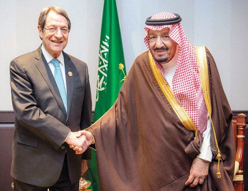 كما التقى خادم الحرمين الشريفين الملك سلمان بن عبدالعزيز آل سعود -حفظه الله- في مقر انعقاد القمة العربية- الأوروبية أمس، فخامة الرئيس نيكوس أناستاسيادس رئيس جمهورية قبرص. وتم خلال اللقاء، مناقشة مجالات التعاون بين البلدين، والموضوعات ذات الاهتمام.