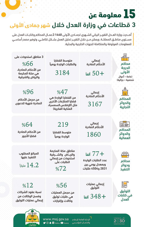 كشف التقرير البياني الشهري لوزارة العدل عن إصدار محاكم الدرجة الأولى (العامة، الأحوال الشخصية والجزائية) أكثر من 50 ألف حكم خلال شهر جمادى الأولى 1440هـ، بزيادة قدرها 15 % عن الأحكام الصادرة في الشهر نفسه من العام الماضي.