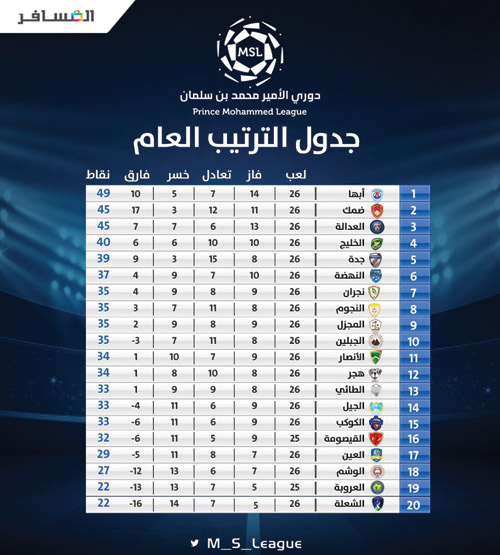 اختتمت الأربعاء الماضي مباريات الجولة الـ26 من منافسات دوري الأمير محمد بن سلمان لأندية الدرجة الأولى لكرة القدم ، ونجح فريق أبها في الاحتفاظ بصدارة جدول الترتيب، بفارق 4 نقاط عن أقرب ملاحقيه، مستفيدا من فوزه على الأنصار بهدف دون رد. ونستعرض من خلال التقرير التالي بعض الحقائق والأرقام عن دوري الأمير محمد بن سلمان للدرجة الأولى، بعد انتهاء 26 جولة من المسابقة، وتبقى 12 مباراة لكل فريق على نهاية الموسم. وأقيمت 10 مباريات في الجولة انتهت7 منها بفوز أحد الفريقين بينما خيم التعادل على 3 لقاءات منها تعادلان إيجابي وآخر سلبي، وسجل خلالها 27 هدفا. وبعد فوز أبها على الأنصار عزز من صدارته لجدول الترتيب برصيد 49 نقطة وبفارق 4 نقاط عن ضمك والعدالة ولكل منهما 45 نقطة، ثم يحل الخليج رابعا بخمس نقاط أقل. ويحتل فريق الشعلة المركز الـ20 في المسابقة بعد مرور 26 جولة، برصيد 22 نقطة بالتساوي مع العروبة التاسع عشر الذي يتفوق بفارق الأهداف، بينما يأتي الوشم في المركز الثامن عشر برصيد 27 نقطة. ولا يزال أبها يمتلك أكبر عدد من الانتصارات بين الفرق المتنافسة في المسابقة برصيد 14 فوزا وبفارق انتصار وحيد عن العدالة و3 انتصارات عن ضمك، ثم يتساوى الخليج والنهضة بالفوز في 10 مباريات حتى الآن، فيما احتفظ فريق جدة بصدارة الفرق الأكثر تحقيقا لنتيجة التعادل وذلك في 15 مباراة، يليه ضمك (12 تعادلا) بفارق مباراة واحدة عن الجبلين والنجوم، وتعادل كل منهما في 11 لقاء. ولم يتعرض فريق للخسارة أكثر من الشعلة الذي هُزم في 14 مباراة خلال 26 جولة، وبفارق هزيمة واحدة عن العروبة والوشم، ثم يتساوى العين والقيصومة والكوكب والجيل بالخسارة في 11 لقاء لكل منهم. ويمتلك فريق ضمك وصيف جدول ترتيب المسابقة أقوى خط هجوم في البطولة بعدما سجل لاعبوه 37 هدفا، بفارق 4 أهداف فقط عن المجزل والنجوم، ثم أبها والعدالة ونجران بـ30 هدفا لكل منهم. وعلى صعيد الهدافين يتساوى شيبان تراوري لاعب النهضة مع كارلوس أندريا من العدالة على صدارة القائمة بـ13 هدفا لكل منهما، يليهما الثنائي سيث سكالا من الطائي وخوسيه فاجاردو لاعب الكوكب (12 هدفا)، بفارق هدف وحيد عن صالح آل عباس مهاجم نجران وهيرمان كواو من النجوم.