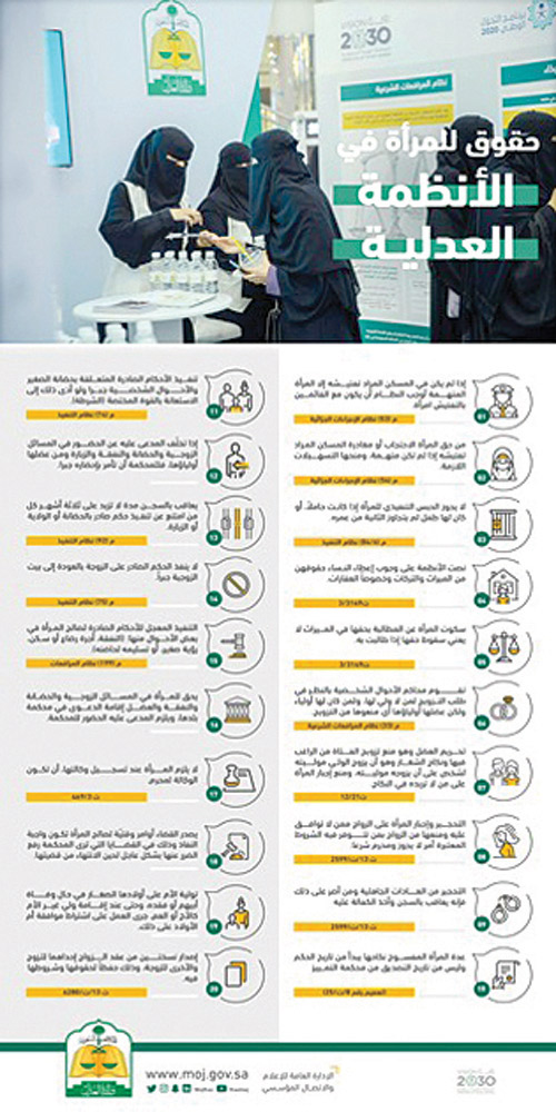 وعززت وزارة العدل حقوق المرأة المستفيدة عبر 20 قرارًا، شملت العديد من النواحي في التعاملات القضائية والعدلية، منها توجيه معالي وزير العدل رئيس المجلس الأعلى للقضاء الدكتور وليد الصمعاني مأذوني الأنكحة بتسليم الزوجة نسخة من عقد النكاح، وأن يقوم المأذون قبل ضبطه عقد النكاح بأخذ موافقة المرأة وفق الوجه الشرعي، وسماع ذلك بنفسه لفظيًّا.