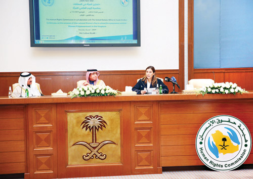 ونوه معالي رئيس هيئة حقوق الإنسان بالتدابير التي اتخذتها المملكة العربية السعودية لحماية حقوق المرأة وتمكينها أبرزها مدونة الأحكام القضائية، وصدور الأمر السامي الذي أكد على جميع الجهات المعنية بعدم مطالبة المرأة بالحصول على موافقة ولي الأمر عند تقديم الخدمة لها أو إنهاء الإجراءات الخاصة بها، وتقلدها مناصب مهمة، بالإضافة إلى تمكينها من الوصول إلى مراكز صنع القرار في القطاعين العام والخاص، مشيراً إلى تعيين صاحبة السمو الملكي الأميرة ريما بنت بندر بن سلطان بن عبدالعزيز سفيرة لخادم الحرمين الشريفين لدى الولايات المتحدة الأمريكية.