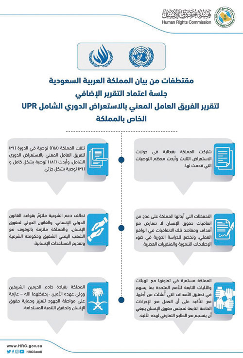 وأكد رئيس الوفد أن جهود المملكة في مجال حماية وتعزيز حقوق الإِنسان ورفع القدرات الوطنية في هذا الجانب ماضية، كما أن جهود نشر ثقافة حقوق الإِنسان والتربية عليها مستمرة اقتناعًا من المملكة بأن تنمية الوعي بحقوق الإِنسان على المستويين الرسمي والاجتماعي تمثل أحد المرتكزات الأساسية لحماية وتعزيز حقوق الإِنسان.