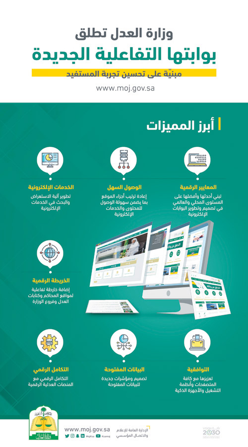 أطلقت وزارة العدل بوابتها التفاعلية الإلكترونية الجديدة التي تستهدف تحسين تجربة المستفيدين من الخدمات العدلية والقضائية المقدَّمة من خلال البوابة التي تأتي بنسخة مطورَّة ومتوافقة مع جميع أنظمة التشغيل والأجهزة الذكيَّة , حيث تأتي هذه البوابة مواكبة للتحول الرقمي الذي تشهده الوزارة بمختلف أعمالها ومرافقها.