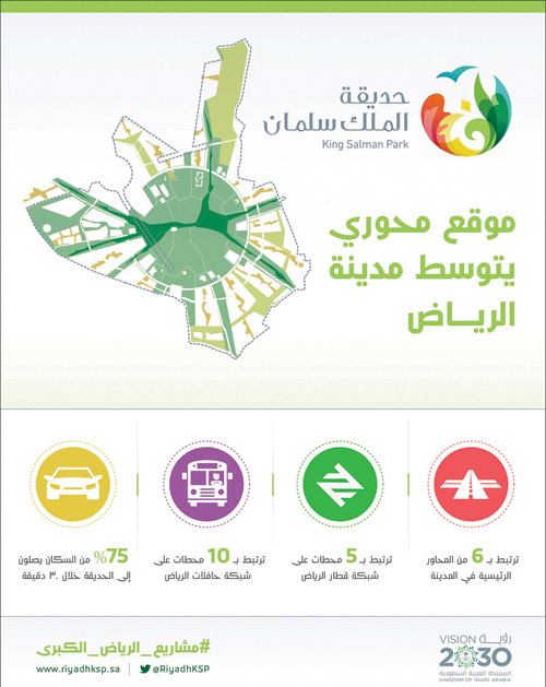 وتعد حديقة الملك سلمان.. أكبر حدائق المدن في العالم بمساحة 13.4 كيلو متر مربعًا وتقام في أرض قاعدة الملك سلمان الجوية (مطار الرياض القديم)، مشكلة أكبر حدائق المدن في العالم، وتتميز بموقعها المحوري الذي يتوسط مدينة الرياض، ويرتبط بستة من طرقها وشرايينها الرئيسة، وبمشروع الملك عبدالعزيز للنقل العام عبر خمس محطات على الخط الأخضر من قطار الرياض، و10 من محطات حافلات الرياض، مما يسهل الوصول إلى الموقع من كافة أرجاء المدينة.