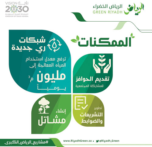 كما سيتم استخدام 72 نوعًا مختارًا من الأشجار المحلية ذات الظل الكثيف التي تلائم بيئة مدينة الرياض، في الوقت الذي سيجري فيه توفير كافة المتطلبات الداعمة والممكنة من: إنشاء شبكة مشاتل لتغذية المشروع بالشتلات، وتطوير التشريعات والضوابط العمرانية لتعزيز التشجير في المشاريع العامة والخاصة، وتقديم الحوافز لكافة فئات المجتمع لتشجيعهم على المشاركة في مبادرات تشجير تطوعية. وستسهم أعمال التشجير بمشيئة الله، في تحسين جودة الهواء عبر الحد من ثاني أوكسيد الكربون بنسب تراوح ما بين 3 و6 في المائة وزيادة نسبة الأوكسجين والرطوبة وتقليص الغبار في الهواء، وخفض درجات الحرارة بمقدار 1.5 إلى 2 درجة مئوية خلال فصل الصيف على مستوى المدينة، وبمقدار 8 درجات مئوية تقريبًا ضمن مناطق التشجير المكثف، والمساهمة في خفض استهلاك الطاقة، وزيادة قدرة المدينة على استيعاب مياه الأمطار واستغلالها والحد من آثارها.