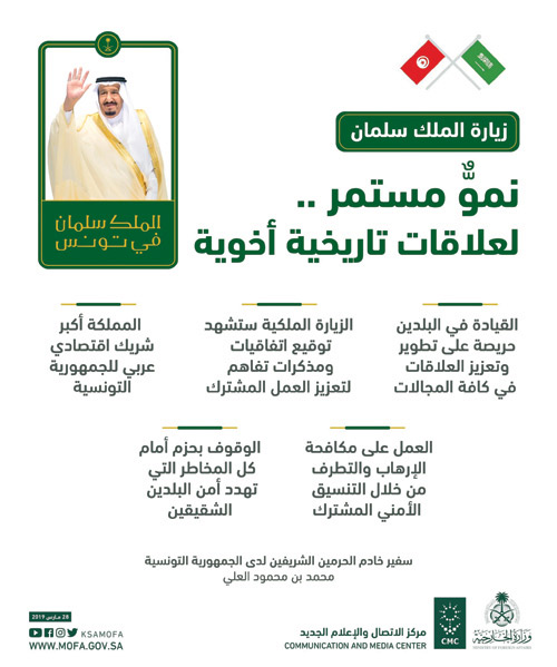 وعد معاليه في ختام تصريحه زيارة خادم الحرمين الشريفين الملك سلمان بن عبد العزيز آل سعود - حفظه الله - إلى تونس فرصة لدعم التعاون القائم بين البلدين سواء على المستوى الحكومي أو على مستوى القطاع الخاص بما يعزز العلاقات الأخوية القائمة ويخدم مصالح الشعبين الشقيقين.