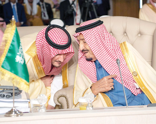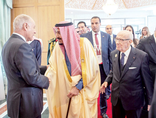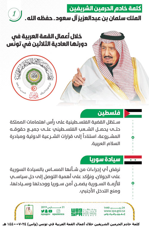 بسم الله الرحمن الرحيم، الحمد لله رب العالمين، والصلاة والسلام على خاتم الأنبياء والمرسلين. فخامة رئيس الجمهورية التونسية الباجي قائد السبسي، أصحاب الجلالة والفخامة والسمو، معالي الأمين العام لجامعة الدول العربية، الحضور الكريم.. السلام عليكم ورحمة الله وبركاته، أشكر الجمهورية التونسية الشقيقة بقيادة فخامة الأخ الرئيس الباجي قائد السبسي على استضافتها لهذه القمة، وعلى ما لقيناه من حسن الاستقبال وكرم الضيافة. والشكر موصول للأشقاء في الدول العربية والأمانة العامة على تعاونهم مع المملكة خلال رئاستها للقمة العربية، التي حرصنا خلالها على دفع مسيرة العمل العربي المشترك لتحقيق تطلعات شعوبنا.