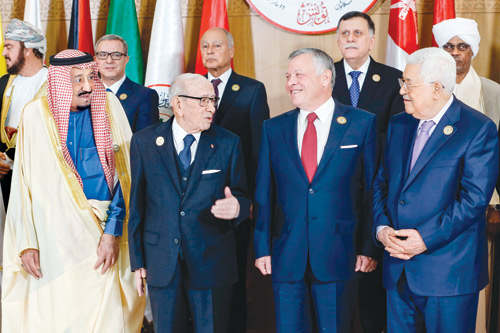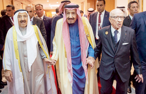 بدأ أصحاب الجلالة والفخامة والسمو والدولة قادة ورؤساء وفود الدول العربية أمس، في تونس أعمال قمتهم العربية في دورتها العادية الثلاثين. وفور وصول خادم الحرمين الشريفين الملك سلمان بن عبدالعزيز آل سعود - حفظه الله - رئيس القمة العربية في دورتها التاسعة والعشرين رئيس وفد المملكة المشارك إلى مقر انعقاد القمة بمركز المؤتمرات في تونس، كان في استقباله فخامة الرئيس الباجي قائد السبسي رئيس الجمهورية التونسية ومعالي الأمين العام لجامعة الدول العربية أحمد أبو الغيط. عقب ذلك، التقطت الصور التذكارية بهذه المناسبة. ثم توجه خادم الحرمين الشريفين، وأصحاب الجلالة والفخامة والسمو والدولة قادة ورؤساء وفود الدول العربية إلى القاعة الرئيسة، حيث بدأت أعمال القمة بتلاوة آيات من القرآن الكريم. إثر ذلك ألقى خادم الحرمين الشريفين الملك سلمان بن عبدالعزيز آل سعود - حفظه الله - الكلمة التالية: