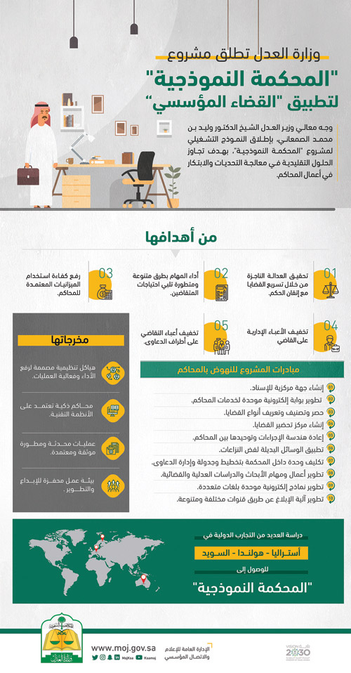 أطلقت وزارة العدل مشروع «المحكمة النموذجية» بهدف ترسيخ البناء المؤسسي للقضاء عبر تطبيق السياسات الإدارية والأنظمة العدلية، والمبادرات التحولية، والبرامج التشغيلية المرتبطة بالمؤشرات، بما يسهم في تطبيق المشروع بشكله النموذجي على بقية محاكم المملكة.