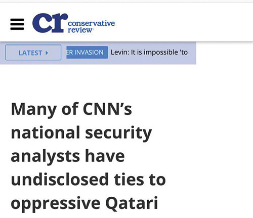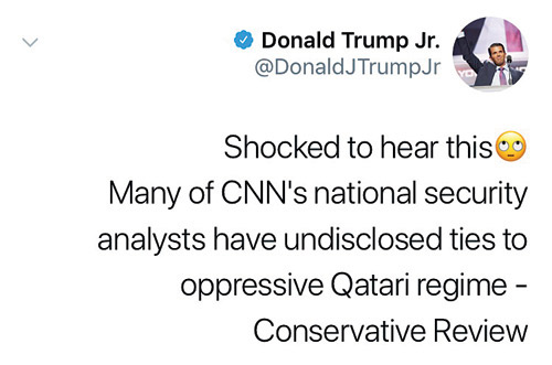 فيما قال دونالد ترمب جونيور في تغريدة له على حسابه على «تويتر» إنه «مصدوم» مما ورد في تقرير نشر على موقع مجلة «كونسيرفيتف ريفيو» conservativereview إن عددًا من محللي شؤون الأمن القومي في قناة CNN الإخبارية على علاقة غير معلنة مع «نظام قطر القمعي»، حيث كشفت المجلة أن عددًا من خبراء الأمن القومى المزعومين في شبكة «سى إن إن» الذين تشاهدهم على شاشات التلفزيون كل ليلة، لديهم روابط مباشرة مع دولة قطر.