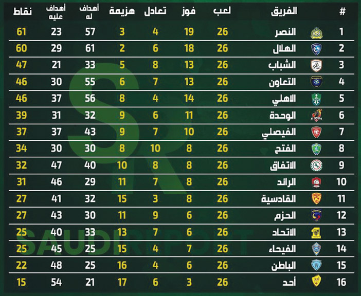 حافظ النصر على صدارة سلم ترتيب المسابقة للجولة الثانية على التوالي بعد أن رفع رصيده إلى 61 نقطة عقب ختام الجولة الـ26 بفارق نقطة واحدة عن الهلال (60 نقطة) الثاني في سلم الترتيب؛ وذلك بفوز الأول على الرائد بخمسة أهداف مقابل هدف، فيما تغلب الثاني على الحزم بثلاثة أهداف مقابل هدفين.