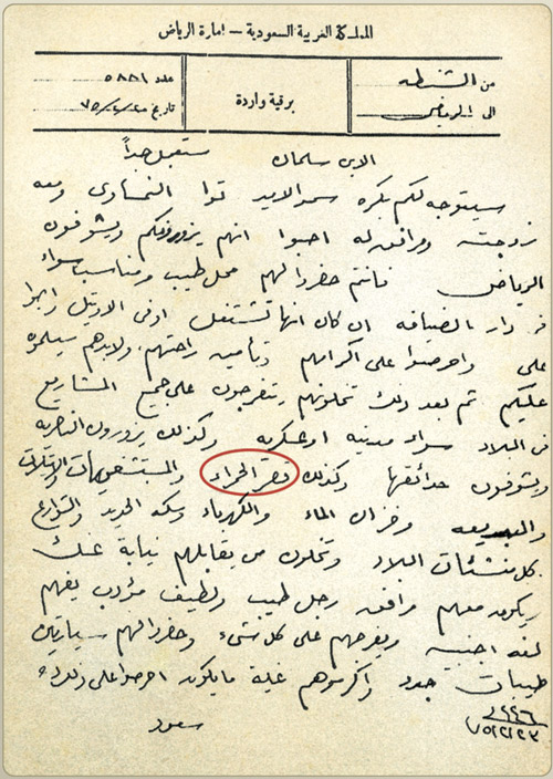 أشير إلى ما نشرته صحيفتكم الغراء في عددها رقم 16991 - صفحة 14، يوم السبت 1 شعبان 1440 هـ، الموافق 6 إبريل 2019 م، حول اسم قصر الحمراء (قصر الملك سعود بالمربع) باسم القصر الأحمر. والصحيح الذي لا جدال فيه أن اسم القصر الرسمي هو قصر الحمراء. أما القصر الأحمر فهو اسم شعبي، يُتداول من قِبل البعض. وما يؤكد هذه الحقيقة الدامغة لاسم قصر الحمراء هو صاحب القصر نفسه جلالة الملك سعود - طيب الله ثراه - في برقيته (المرفق صورتها) بتوقيع جلالته (سعود) برقم 5881 وتاريخ 1375/2/20هـ بشأن توجيهه - رحمه الله - لخادم الحرمين الشريفين الملك سلمان بن عبدالعزيز - حفظه الله - عندما كان أميراً للرياض حول زيارة الأمير توا النمساوي وزوجته إلى مدينة الرياض للاطلاع على نهضتها وتطورها العمراني. ومن ضمن برنامج زيارة ذلك الأمير الاطلاع على عدد من المنشآت العمرانية التي ذكرها الملك سعود نصاً، ومنها (قصر الحمراء). كذلك يؤكد اسم قصر الحمراء ذكره نصاً أيضًا في قرار مجلس الوزراء الموقر رقم 782 وتاريخ 1386/11/3 هـ حول ترميم القصر في ذلك العام (مرفق صورته). كما تؤكد صحيفة أم القرى الرسمية اسم قصر الحمراء بما نشرته من الأحداث والقرارات التي تمت في القصر. كما أنه يُعرف بقصر الحمراء لدى العديد من المخضرمين من سكان الرياض.