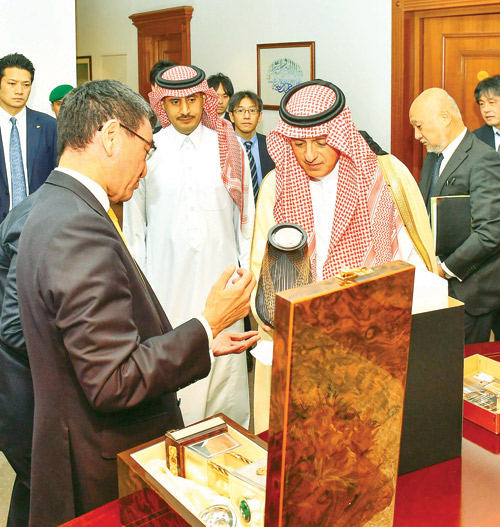 عقد معالي وزير الدولة للشؤون الخارجية وعضو مجلس الوزراء الأستاذ عادل بن أحمد الجبير في مكتبه بوزارة الخارجية بالرياض أمس جلسة مباحثات ثنائية مع معالي وزير الخارجية الياباني تارو كونو. وجرى خلال جلسة المباحثات بحث العلاقات الثنائية وسبل تعزيزها وتطويرها، وآفاق الشراكة بين البلدين، والقضايا الإقليمية والدولية ذات الاهتمام المشترك.